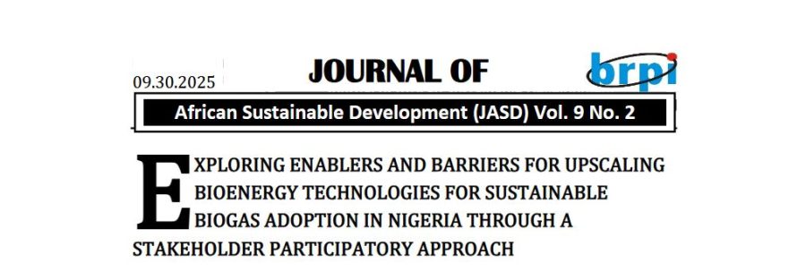 Please find time to grow through this publication where yours sincerely is a Co- author: EXPLORING ENABLERS AND BARRIERS FOR UPSCALING BIOENERGY TECHNOLOGIES FOR SUSTAINABLE BIOGAS ADOPTION IN NIGERIA THROUGH STAKEHOLDER PARTICIPATORY APPROACH.